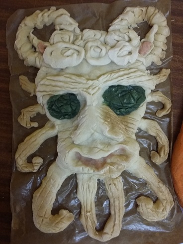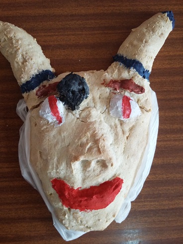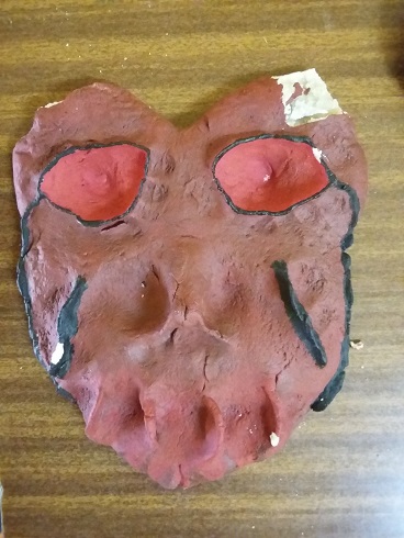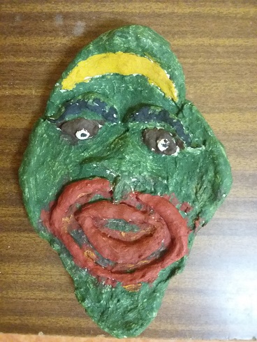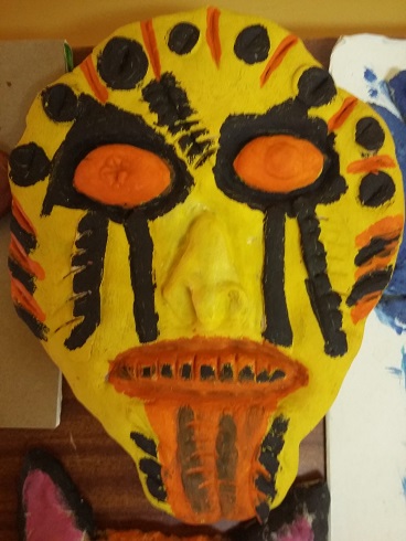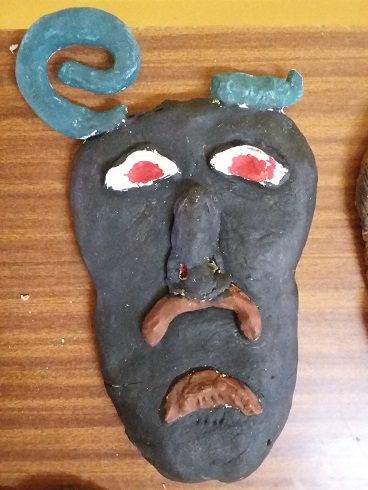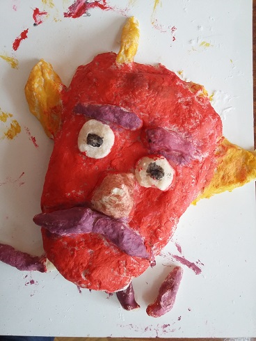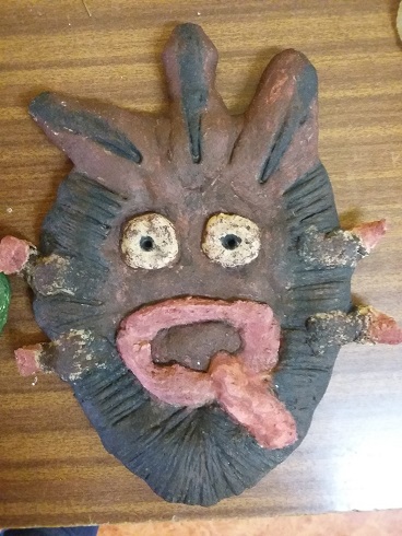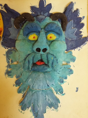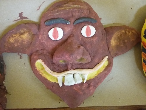 Uczniowie wykonali własne wersje maszkaronów z masy solnej, pomalowanej farbami plakatowymi.