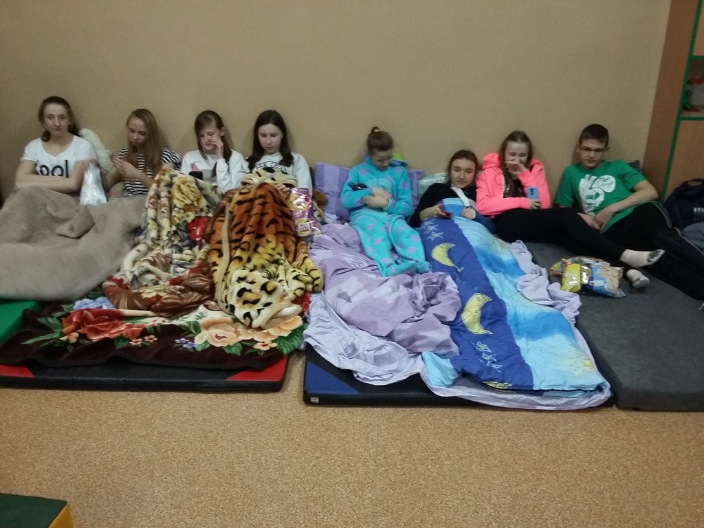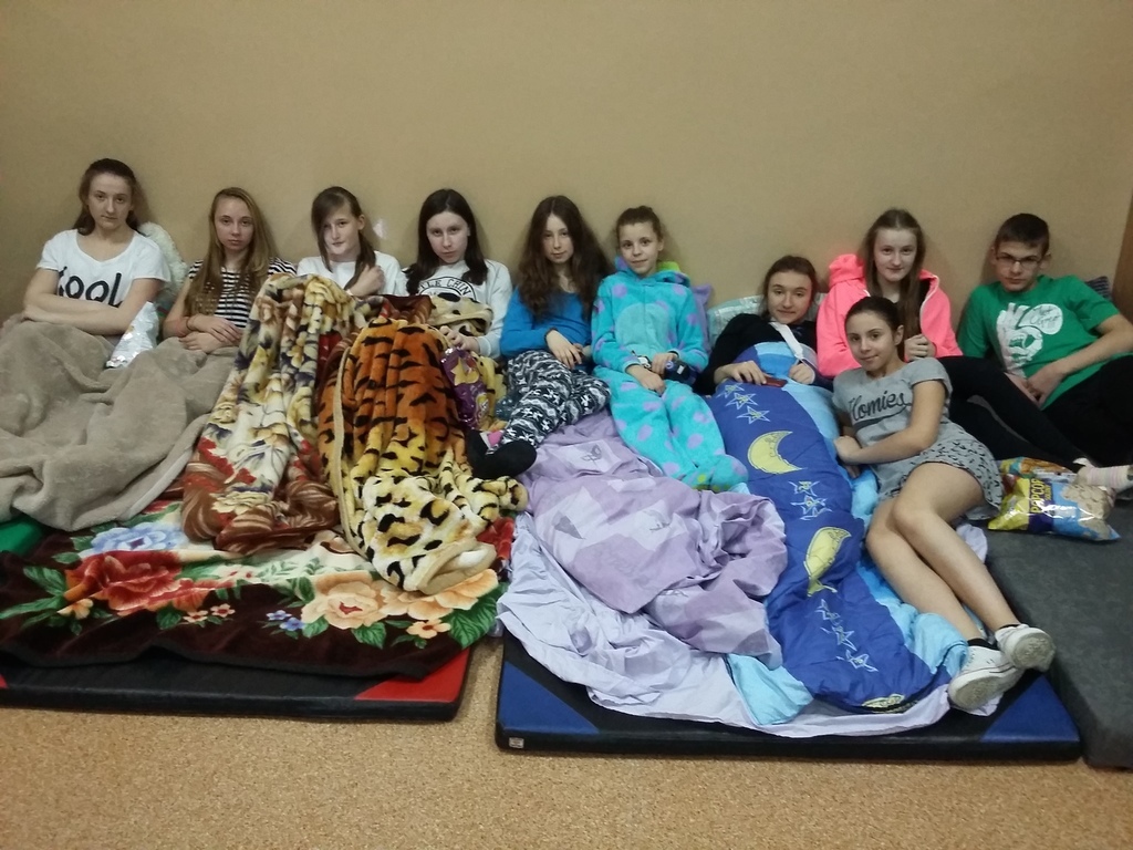 Kolejna, wspólnie spędzona noc za nami. Takie działania integracyjne cieszą się coraz większą popularnością wśród młodzieży szkolnej. 12 lutego 2016 roku, noc z piątku na sobotę, chętni uczniowie z klas Ia, Ib i II gimnazjum wraz z opiekunami: panią Ewą Wronką, panią Lucyną Król – Niedziałek i panią Joanną Jackowską, spędzili w szkole.