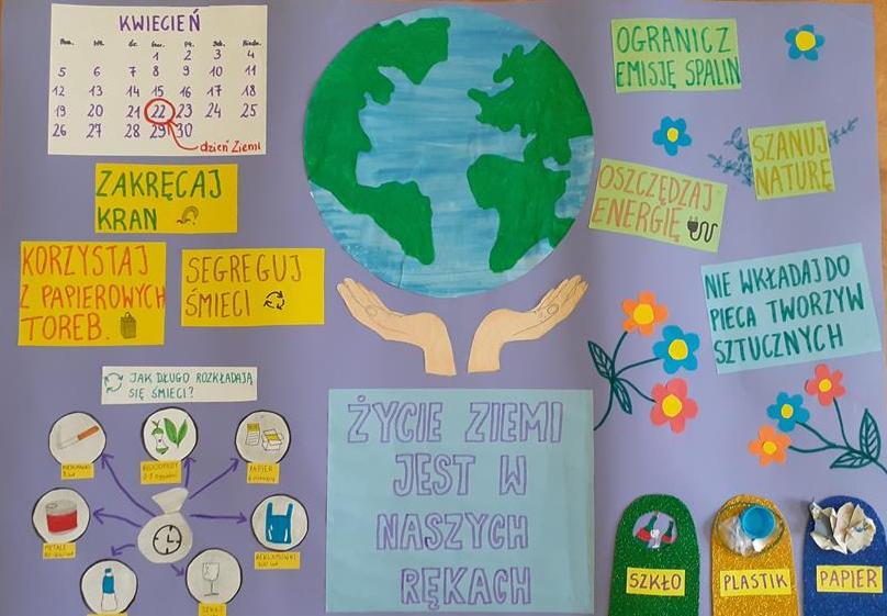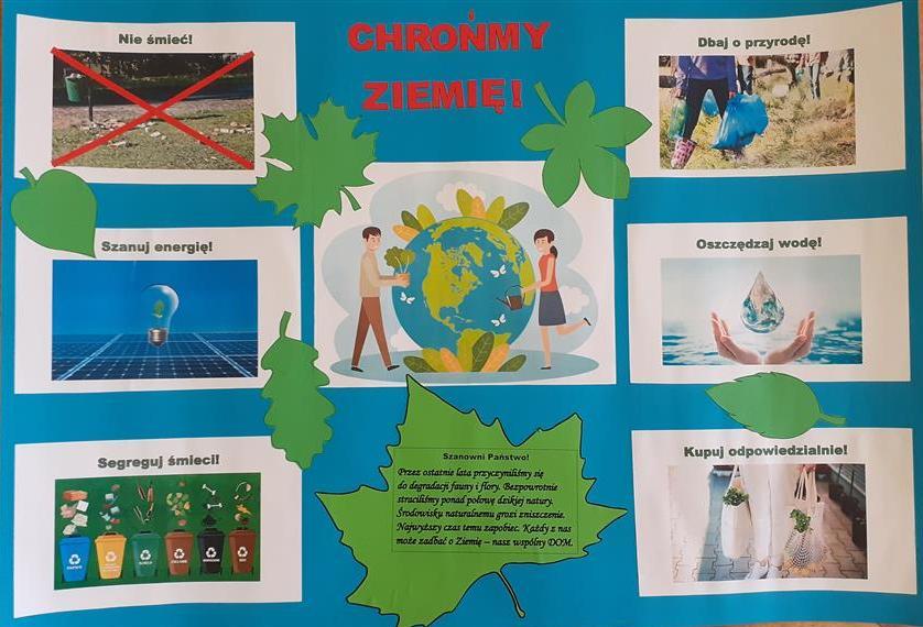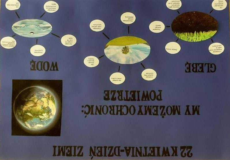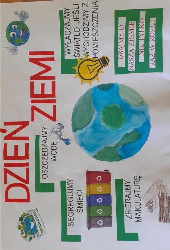 Dzień Ziemi to wydarzenie obowiązkowe w kalendarzu każdego miłośnika przyrody. Jest to idealny moment w roku na podkreślenie znaczenia wspólnego dbania o naszą planetę i promowanie postaw proekologicznych. To także dobry czas na zastanowienie czy nasze codzienne nawyki są przyjazne dla środowiska i co możemy w nich poprawić. W naszej szkole uczniowie wszystkich klas projektowali gazetki, na których nawoływali do troski o powietrze, wodę i glebę. Proponowali działania, przyczyniające się do poprawy stanu środowiska naturalnego.