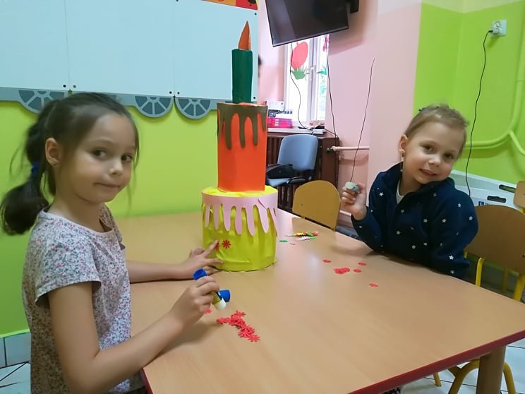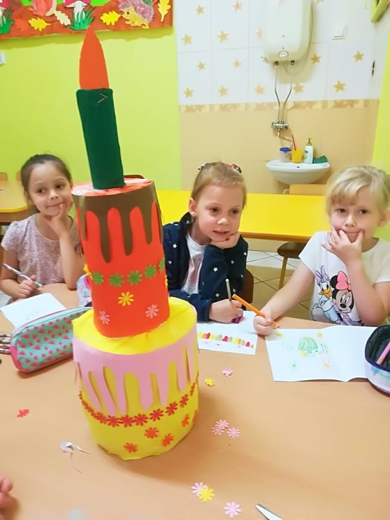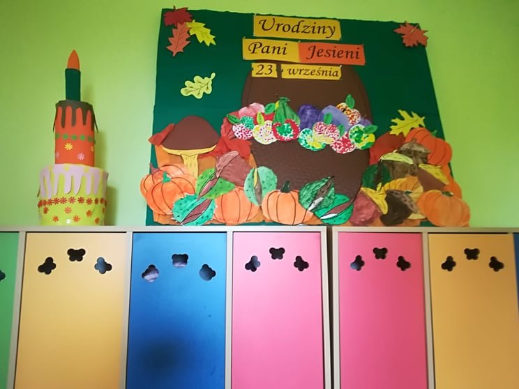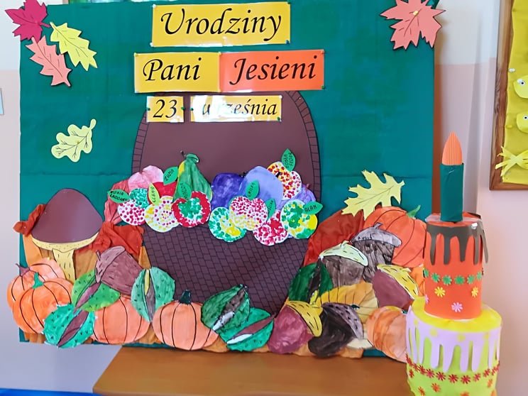 Dnia 23 września dzieci z przedszkola i kl. ,,0’’ obchodziły Urodziny Pani Jesieni. Ten uroczysty dzień poprzedziły liczne przygotowania. Dzieci wycinały i malowały różnymi technikami dary jesieni, uczyły się rymowanek jesiennych i piosenek połączonych z zabawami ruchowymi oraz wykonały laurki dla Pani Jesieni. Na koniec przygotowały piękny, kolorowy, piętrowy tort, który ozdobiły kolorami jesieni.